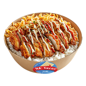 Riz, sauce tasty, sauce fromagère, persil, oignons frits, sauce chili thaï.